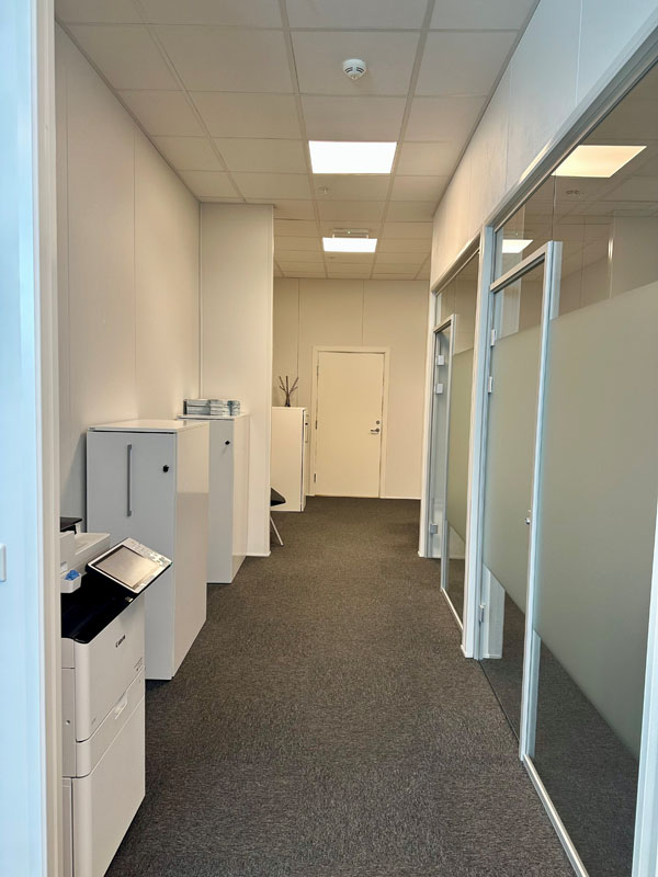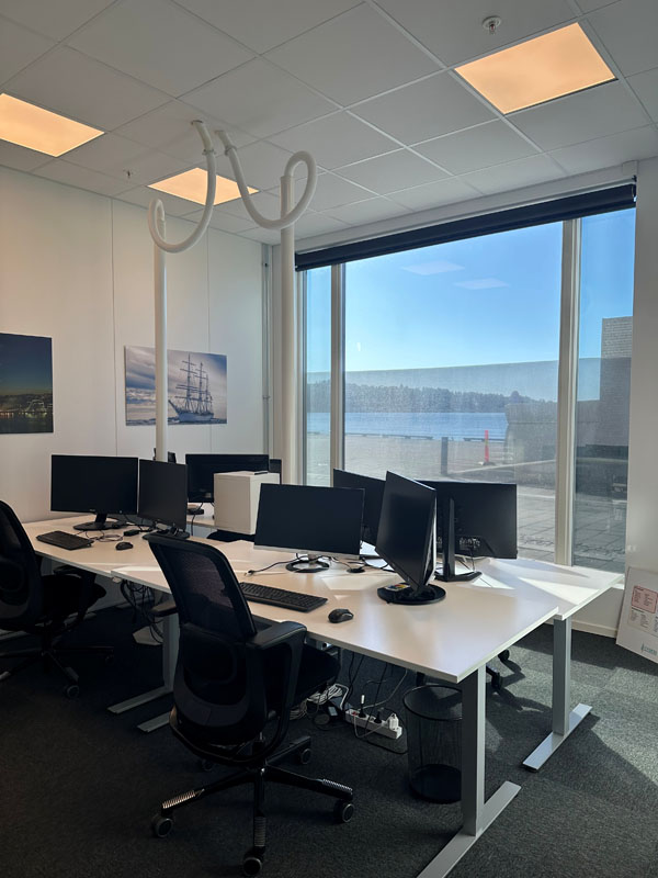 - Et lyst og luftig kontorlandskap med fire ferdig riggede pulter (skjermer og tastatur klart til bruk!)